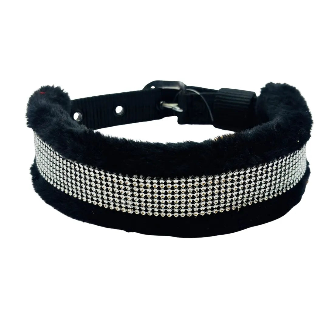 Give your dog a touch of glamour and luxury with the Fancy Fur Collar for Dogs with Sparkle Stones. This unique collar is designed for fashion-forward pets, blending comfort with dazzling style. The main body of the collar is constructed with a durable nylon webbing base in a rich, Black color.