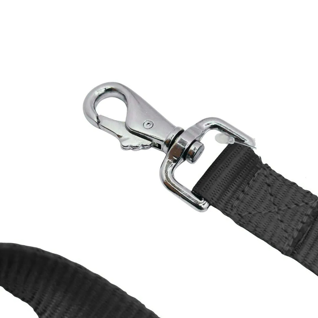 The leash features a heavy-duty, polished silver snap hook (typically zinc alloy or chrome-plated metal) with a classic bolt-snap design. This mechanism allows for quick, one-handed attachment and detachment from your dog's collar or harness, while providing a secure lock that prevents accidental release. The simple yet effective design comes in a timeless black color that pairs well with any collar. Durable stitching reinforces the connection points, making this leash an essential and trustworthy tool for safe and enjoyable outings with your canine companion.