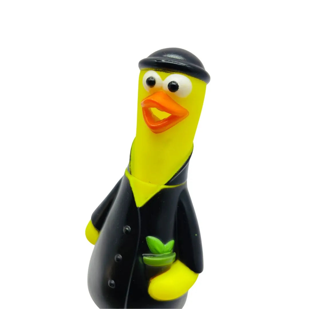 Comical Design: Features a unique and amusing yellow duck dressed in a black suit, hat, and boots, holding a potted plant.