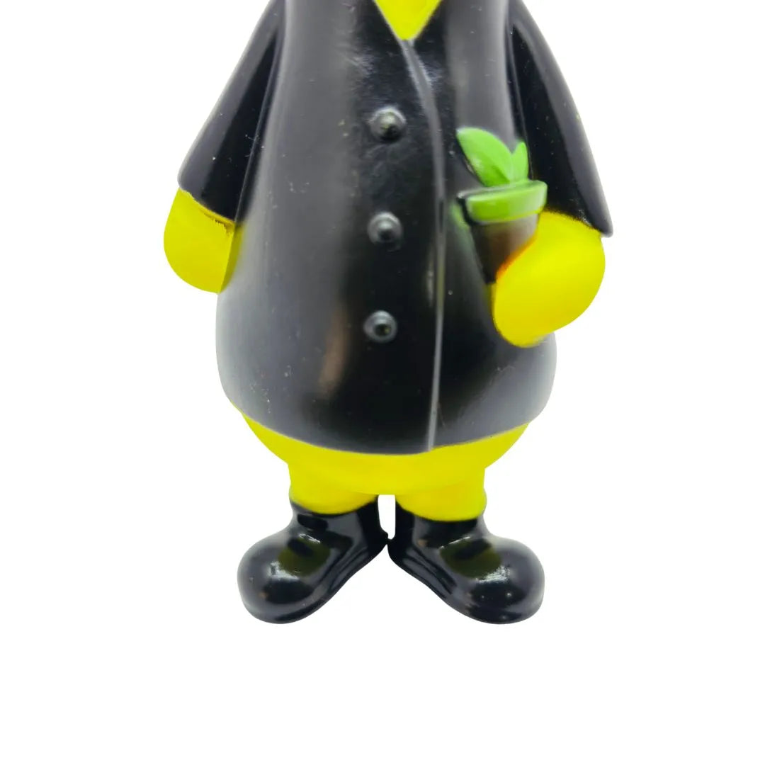 Color: Bright Yellow body, Black hat, suit, and boots, Orange beak, and Green plant accessory.