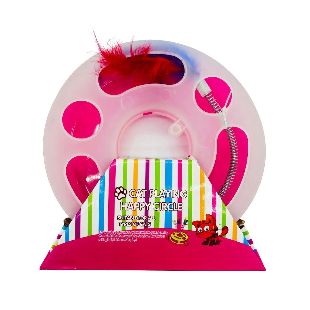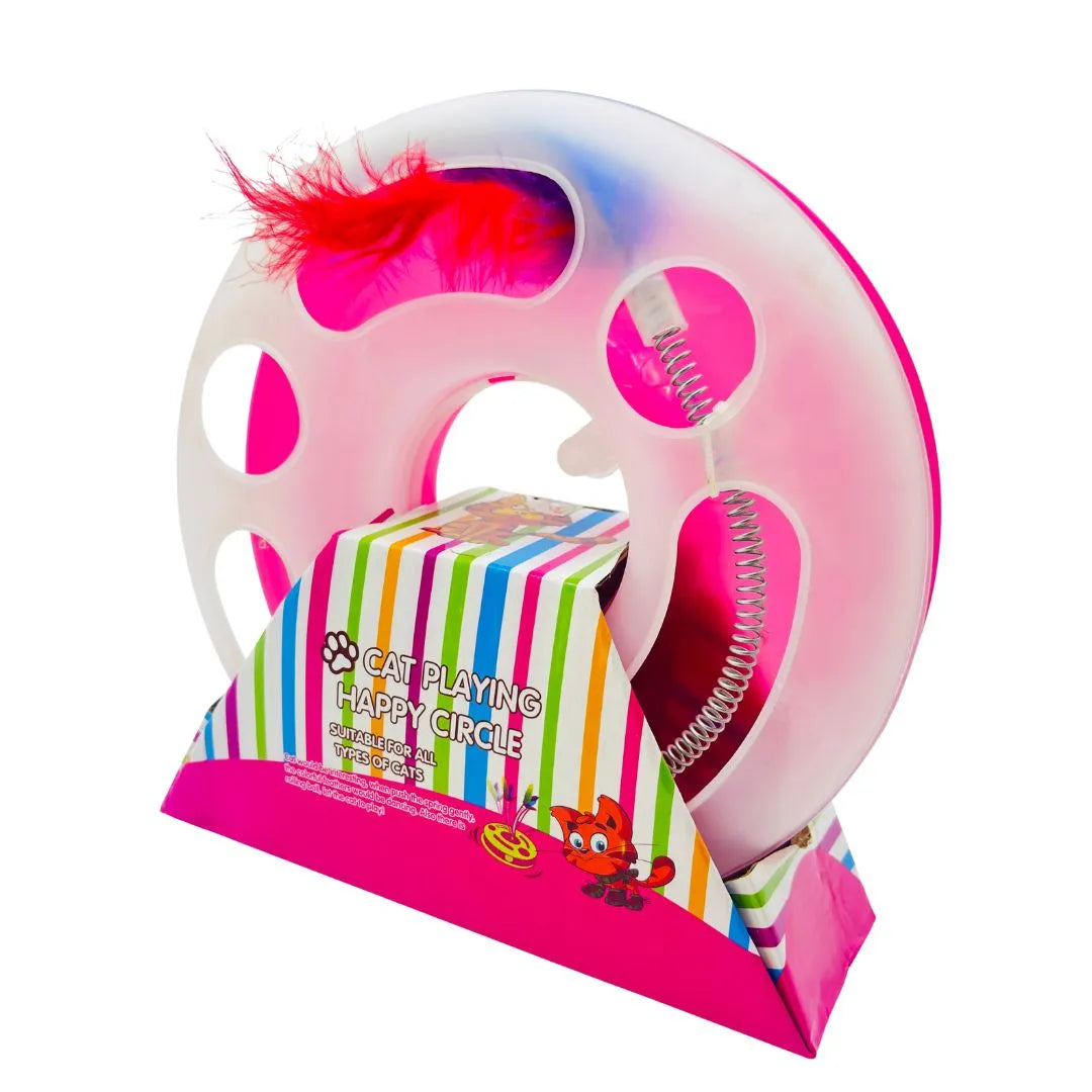 Keep your feline friend entertained for hours with the Cat Playing Happy Circle Toy. This dynamic, multi-activity station is designed to engage your cat's curiosity and hunting instincts, combining three irresistible elements of play into one exciting package. The core of the toy is a durable, translucent plastic circle track with a vibrant pink inner ring that houses an unseen rolling element (likely a ball or rattle), providing continuous motion and sound as your cat bats and spins the wheel.