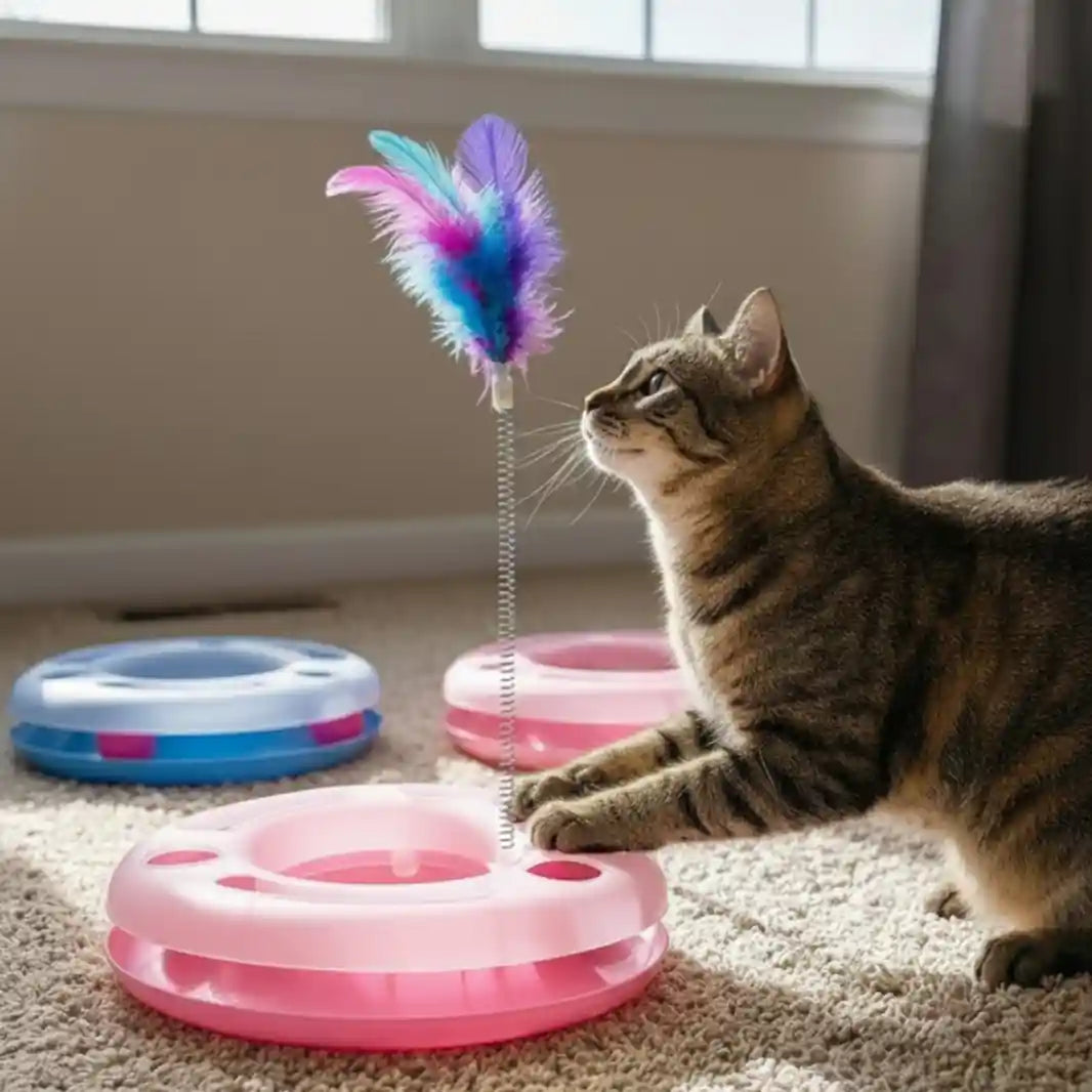 Adding to the fun, the toy features a prominent spring-mounted feather attachment near the top. This elastic spring causes the cluster of pink and red feathers to bob, wiggle, and spring back unpredictably with every touch, mimicking the erratic movement of prey. Furthermore, the track itself incorporates large coiled springs visible on the sides, which may contribute to the toy's spin or provide an extra sensory texture. This combination of chasing a rolling object, batting at a springing lure, and stimulating texture provides a well-rounded outlet for your cat's energy, helping to relieve boredom and promote healthy activity.