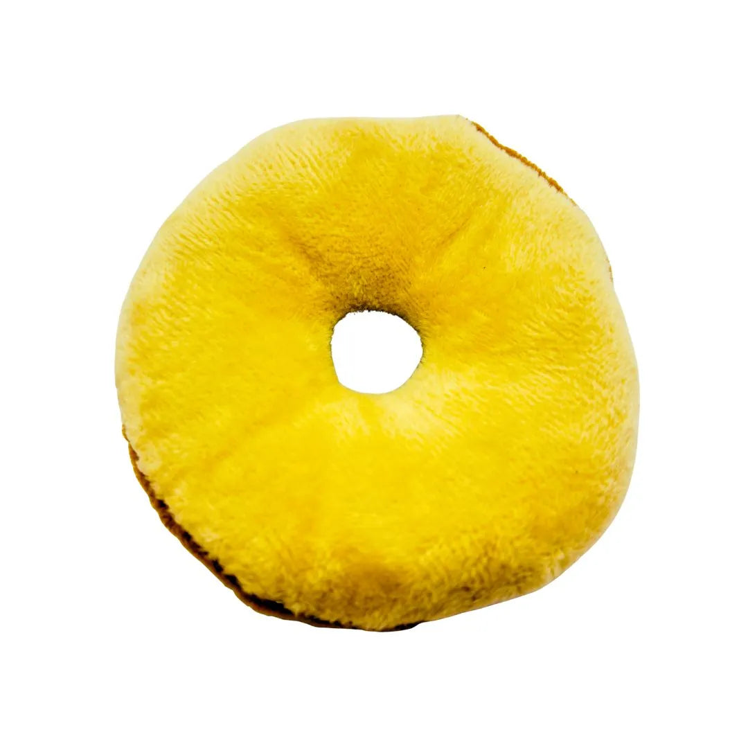 Inside the toy, a delightful surprise awaits: a squeaker (or crinkle material) is embedded to capture your dog's attention and satisfy their urge to chew and make noise. The soft, rounded, and lightweight shape makes it perfect for cuddling, gentle fetching, and interactive games of toss and catch. The plush texture and charming design make this donut toy an adorable and engaging addition to any pet's collection.