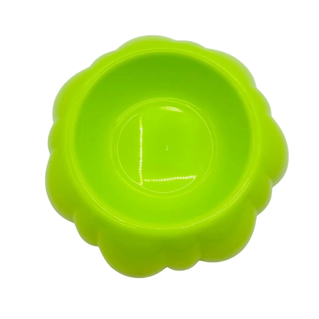 Serve your pet's meals with a touch of fun style using this Fancy Design Blue Plastic Pet Feeding Bowl. This bowl features a bright, appealing green color and a unique, decorative fluted exterior design that resembles a flower or clam shell. The rounded, robust shape provides a wide, stable base, helping to prevent tipping and sliding during mealtime.