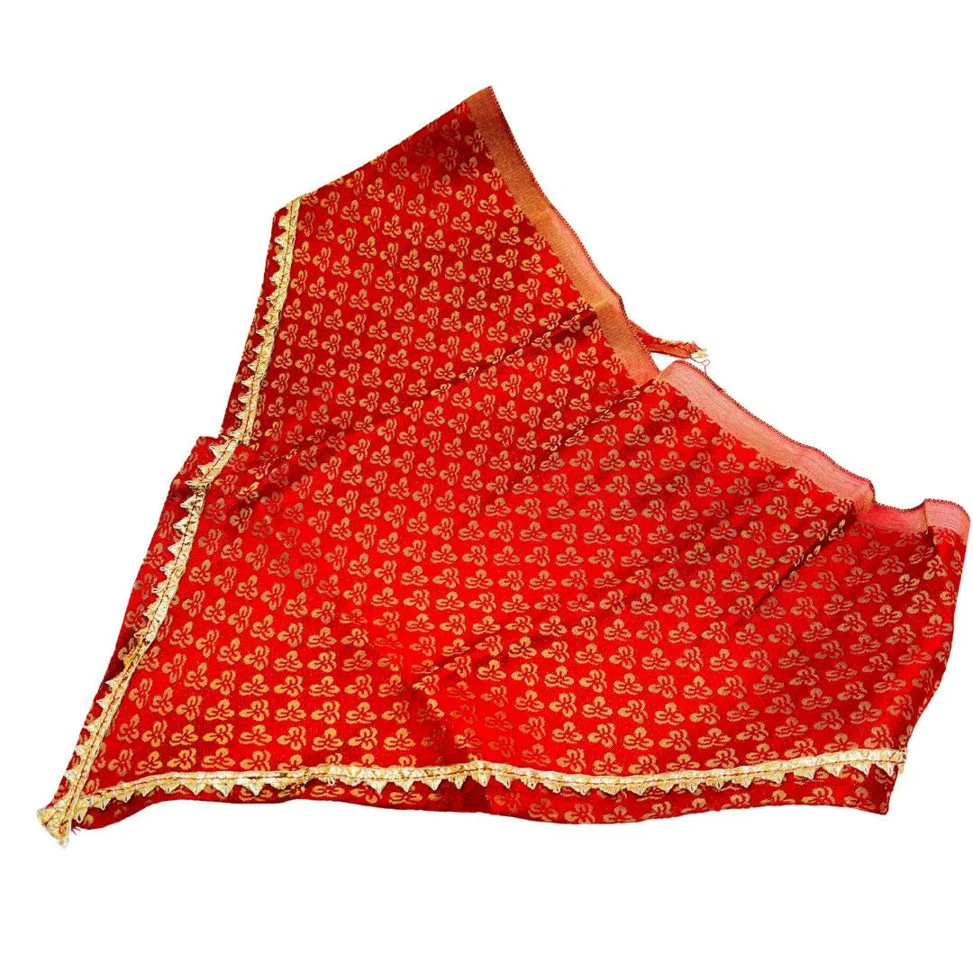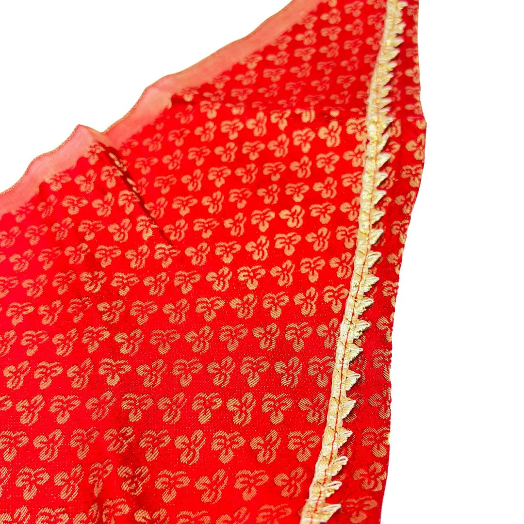 Color: Deep Red base with Shimmering Gold/Yellow print and trim.