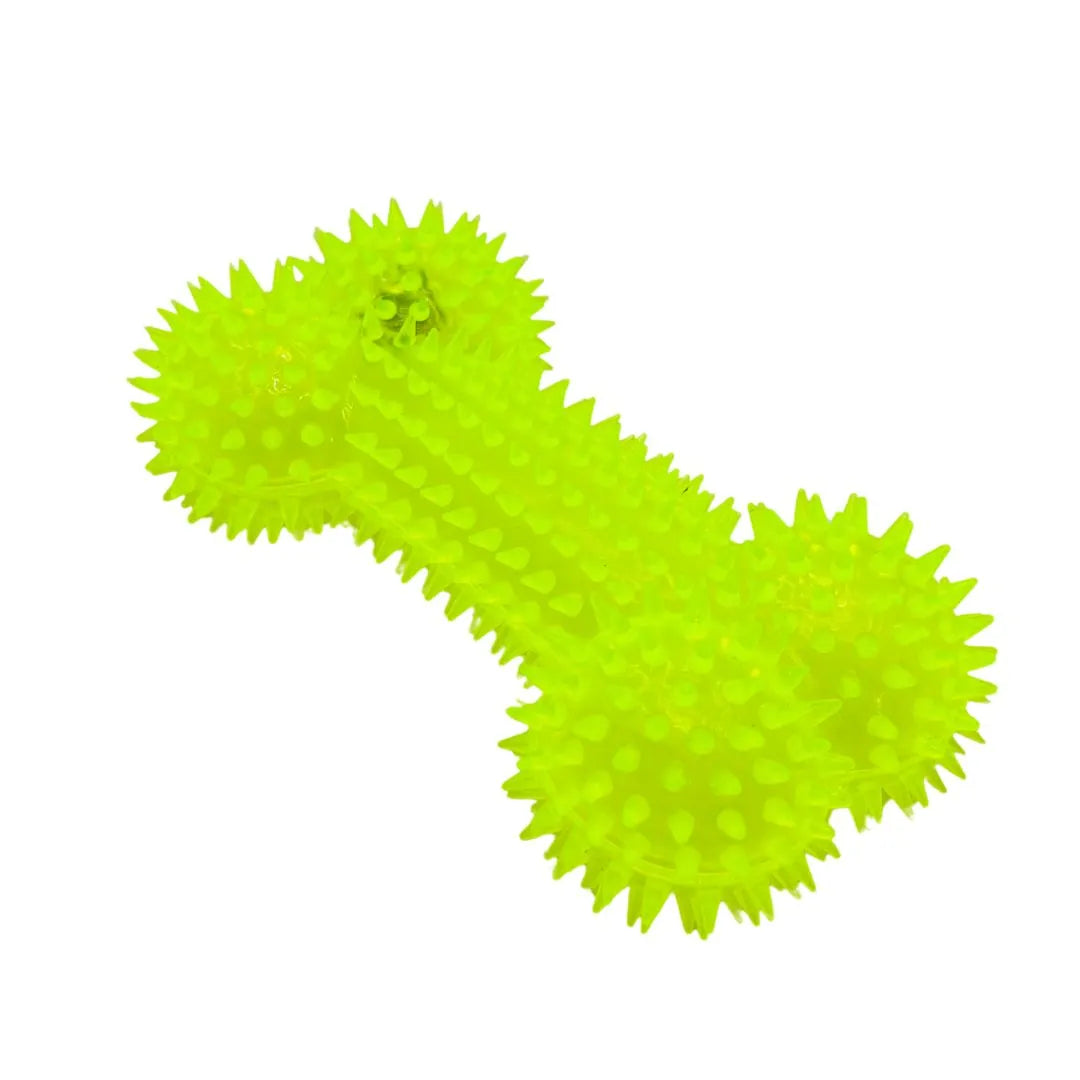 Ignite your dog's playtime with this highly stimulating Flashing, Spiky Yellow Squeaky Bone Dog Toy. Designed for both fun and engagement, this toy features a classic bone shape covered entirely in soft, flexible spikes or nodules. This textured surface provides excellent tactile sensation for chewing and helps massage gums and clean teeth during play.