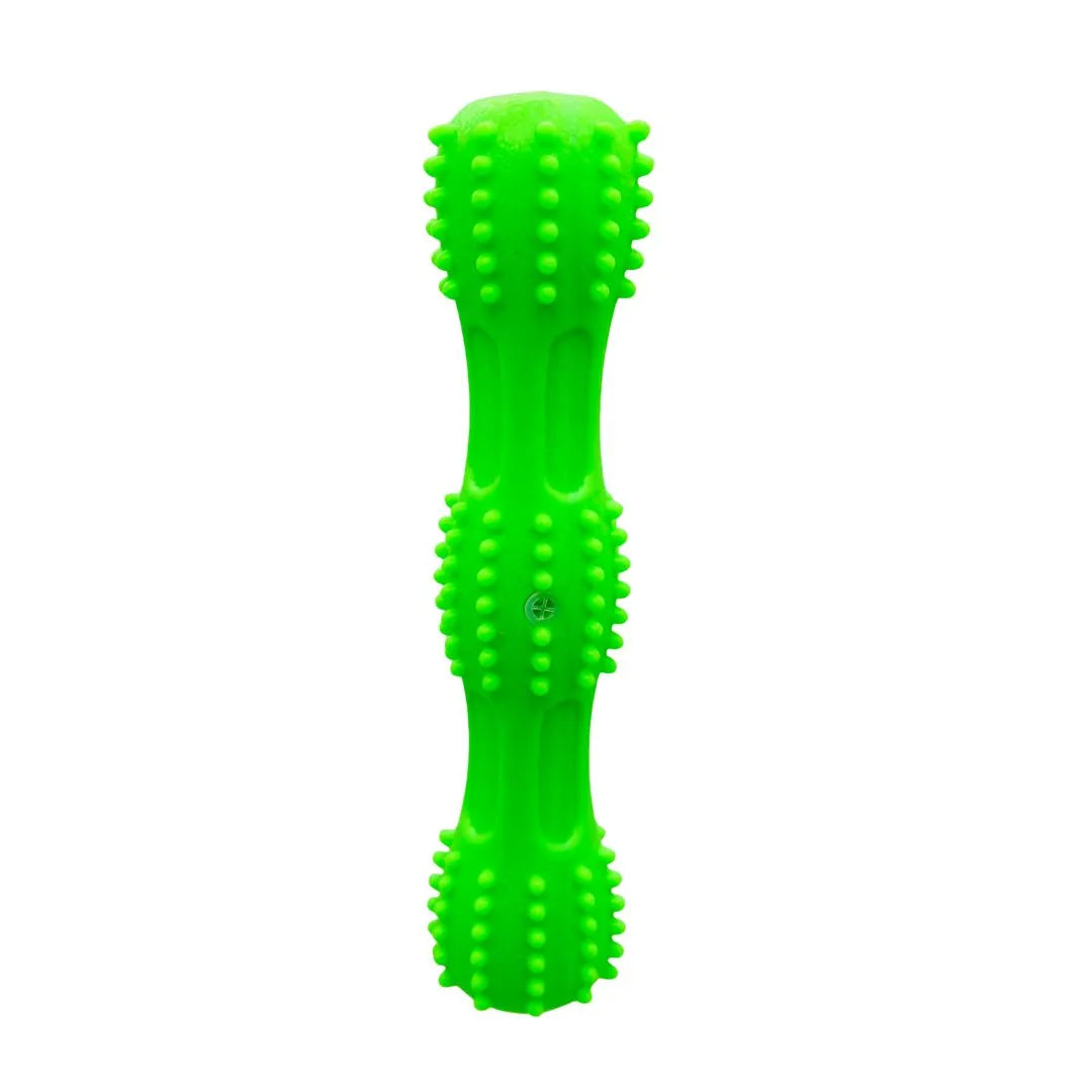 The surface of the toy is covered in firm, rounded nubs or spikes which provide a fun, interesting texture for dogs to mouth and carry. The tapered center section is easy for dogs to grip. The best part is the built-in squeaker, which produces an exciting sound when squeezed or bitten, instantly grabbing your dog's attention and encouraging active, engaging playtime. This squeaky dumbbell is a simple, effective toy for hours of energetic fun.