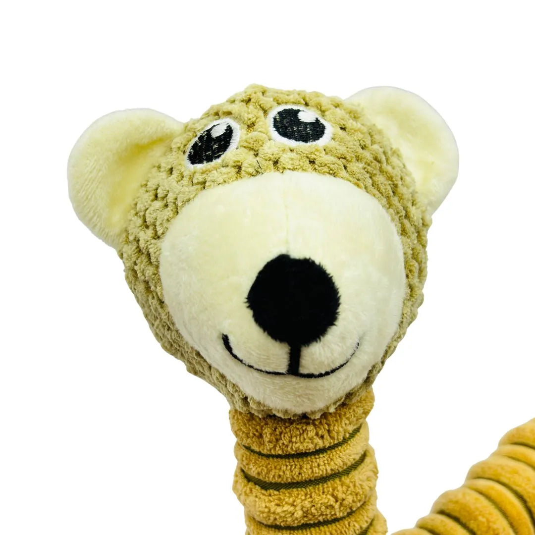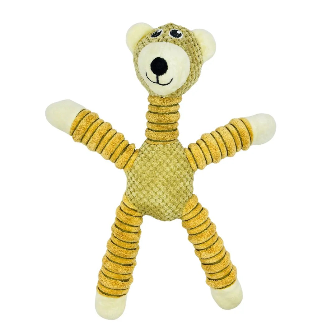 The distinctively long and ribbed limbs and neck are not only easy for dogs to grip and shake, but they also conceal exciting crinkle material, providing an irresistible sound that encourages engagement. A built-in squeaker is hidden within the body, adding another layer of auditory fun that will capture your dog's attention and satisfy their natural instincts. The charming bear head features embroidered eyes and a sweet smile, making it an appealing companion for cuddling during downtime. Ideal for fetch, tug-of-war, or simply as a comforting friend, the Happy Bear Soft Plush Toy is a fantastic addition to your dog's toy collection.