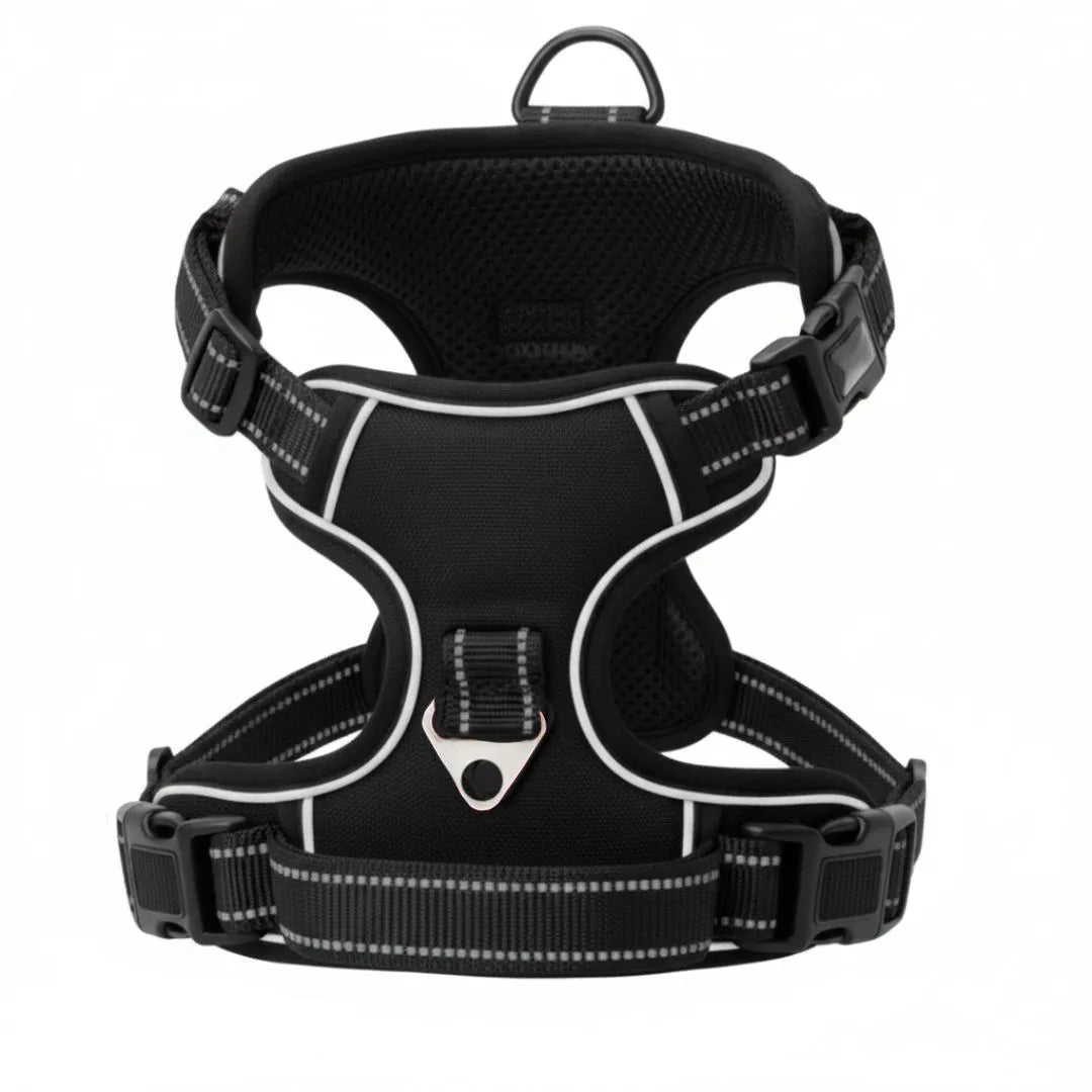 The harness features durable black nylon straps with reflective stitching, significantly improving nighttime or low-light visibility to keep your pet safe outdoors. Multiple adjustable points around the neck and chest allow you to create a custom, comfortable fit. A sturdy top-mounted D-ring provides secure, reliable leash attachment.