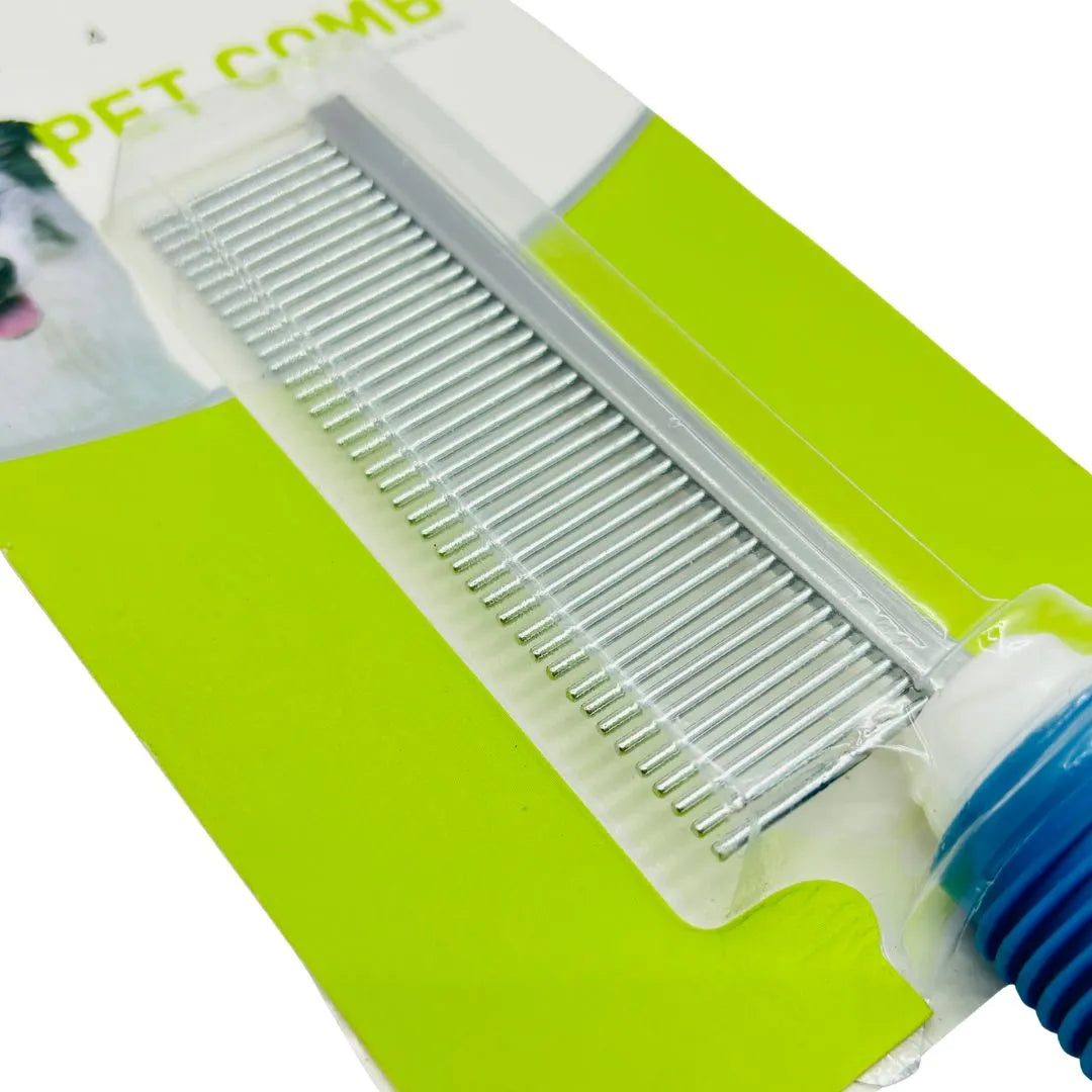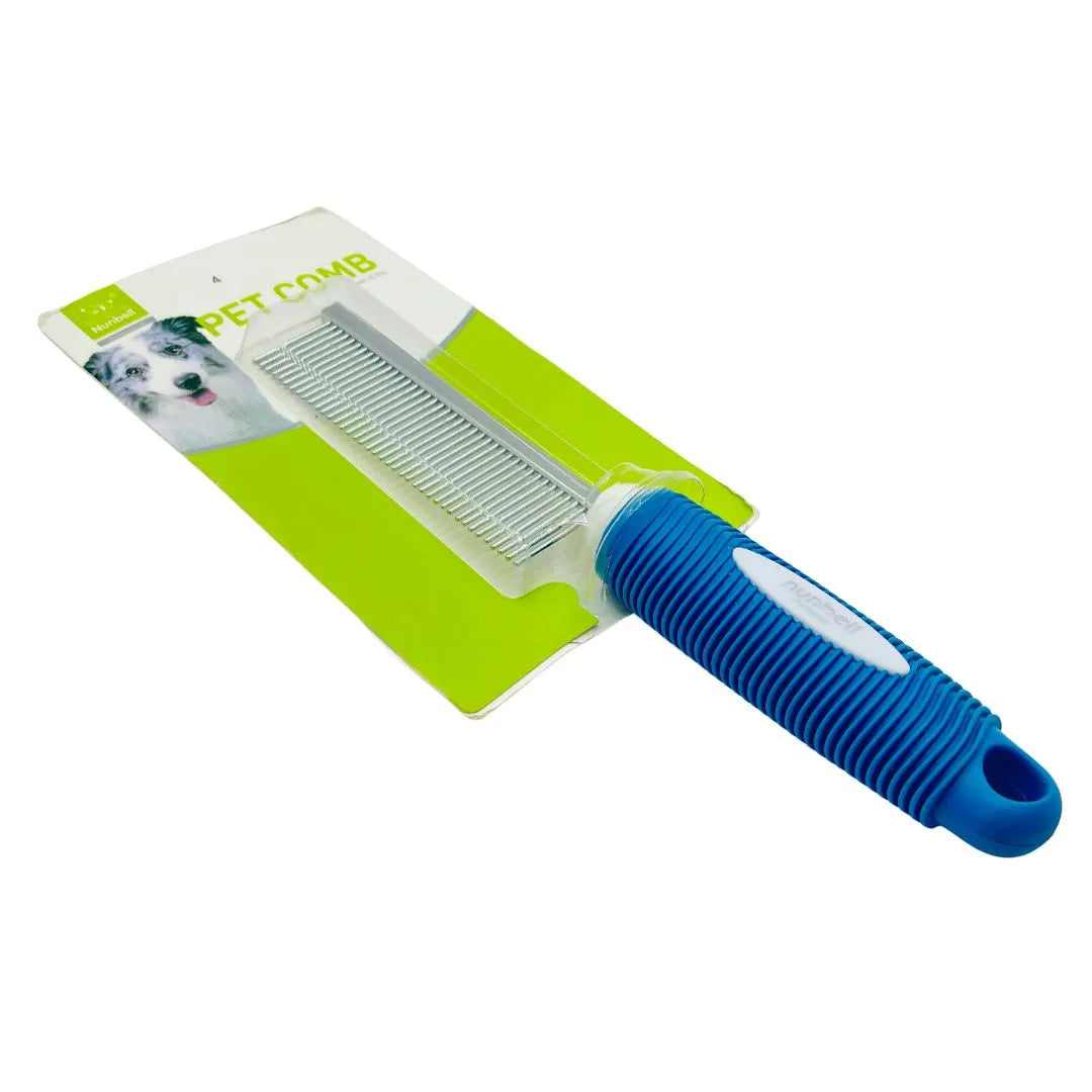 The comb is constructed for comfort and control, featuring a non-slip rubber handle in a vibrant blue color. The ergonomic, grooved grip ensures the comb remains secure in your hand, even during longer grooming sessions. Its single-sided design is versatile enough for both short and long-haired breeds, making regular grooming simple and comfortable for both you and your pet.