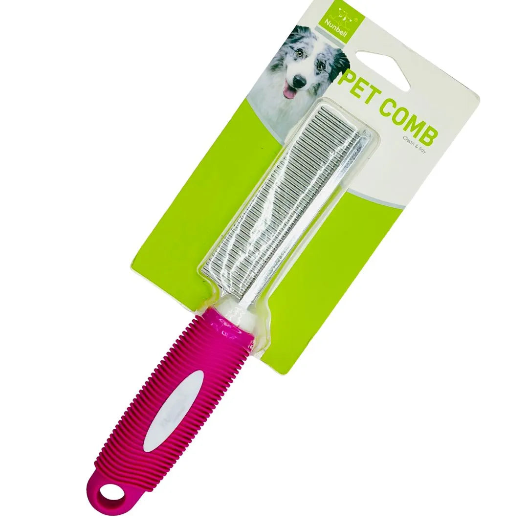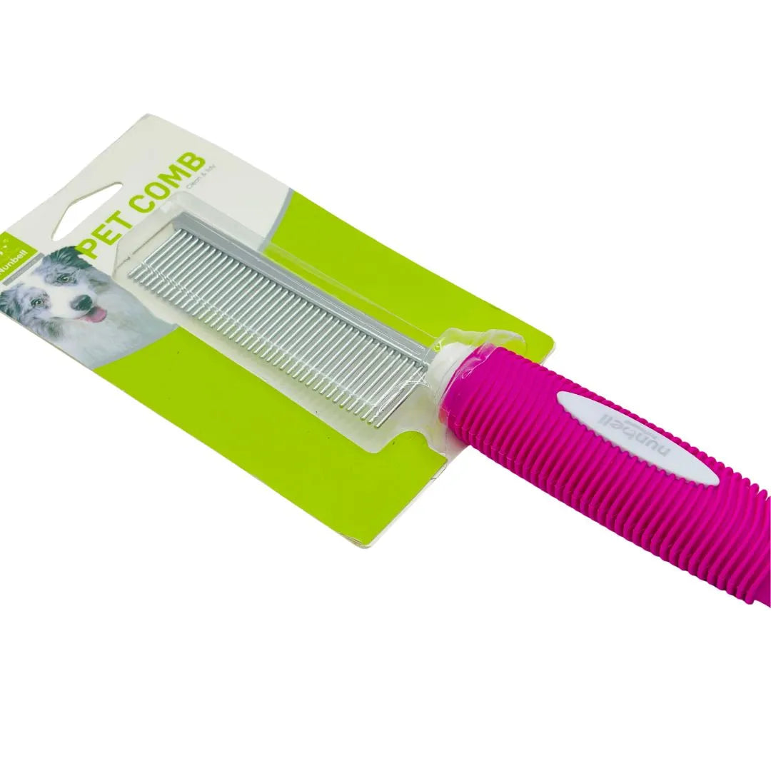 The comb is constructed for comfort and control, featuring a non-slip rubber handle in a vibrant pink color. The ergonomic, grooved grip ensures the comb remains secure in your hand, even during longer grooming sessions. Its single-sided design is versatile enough for both short and long-haired breeds, making regular grooming simple and comfortable for both you and your pet.