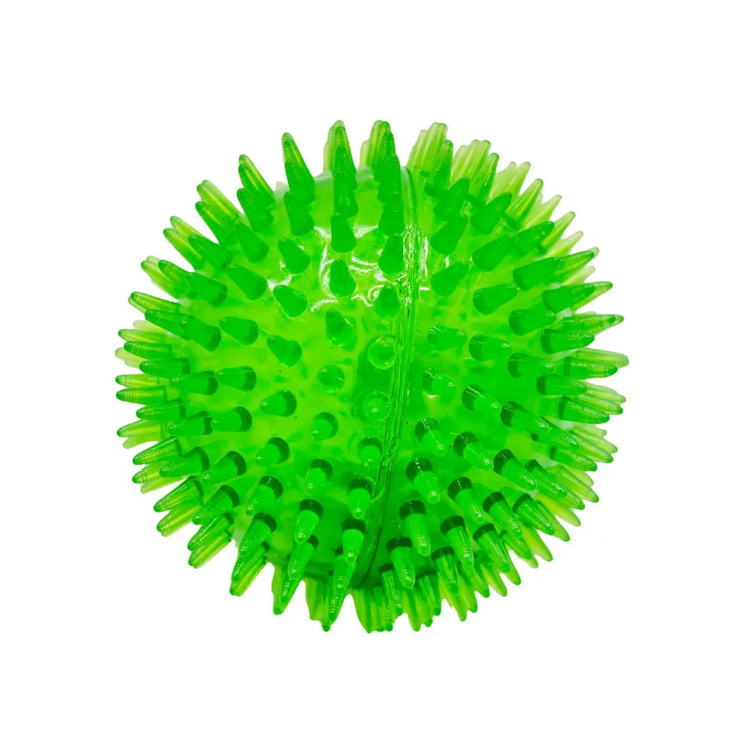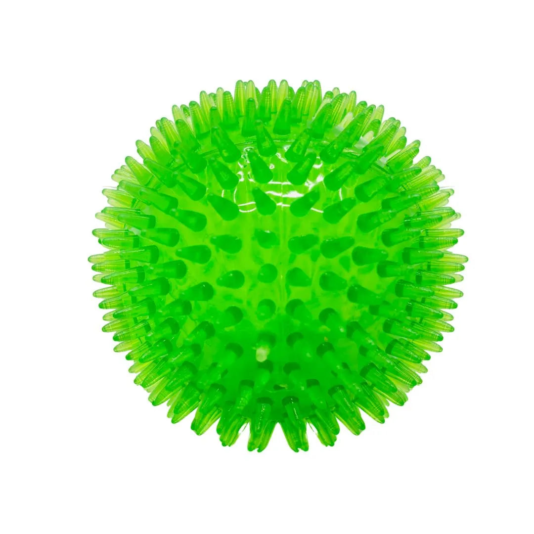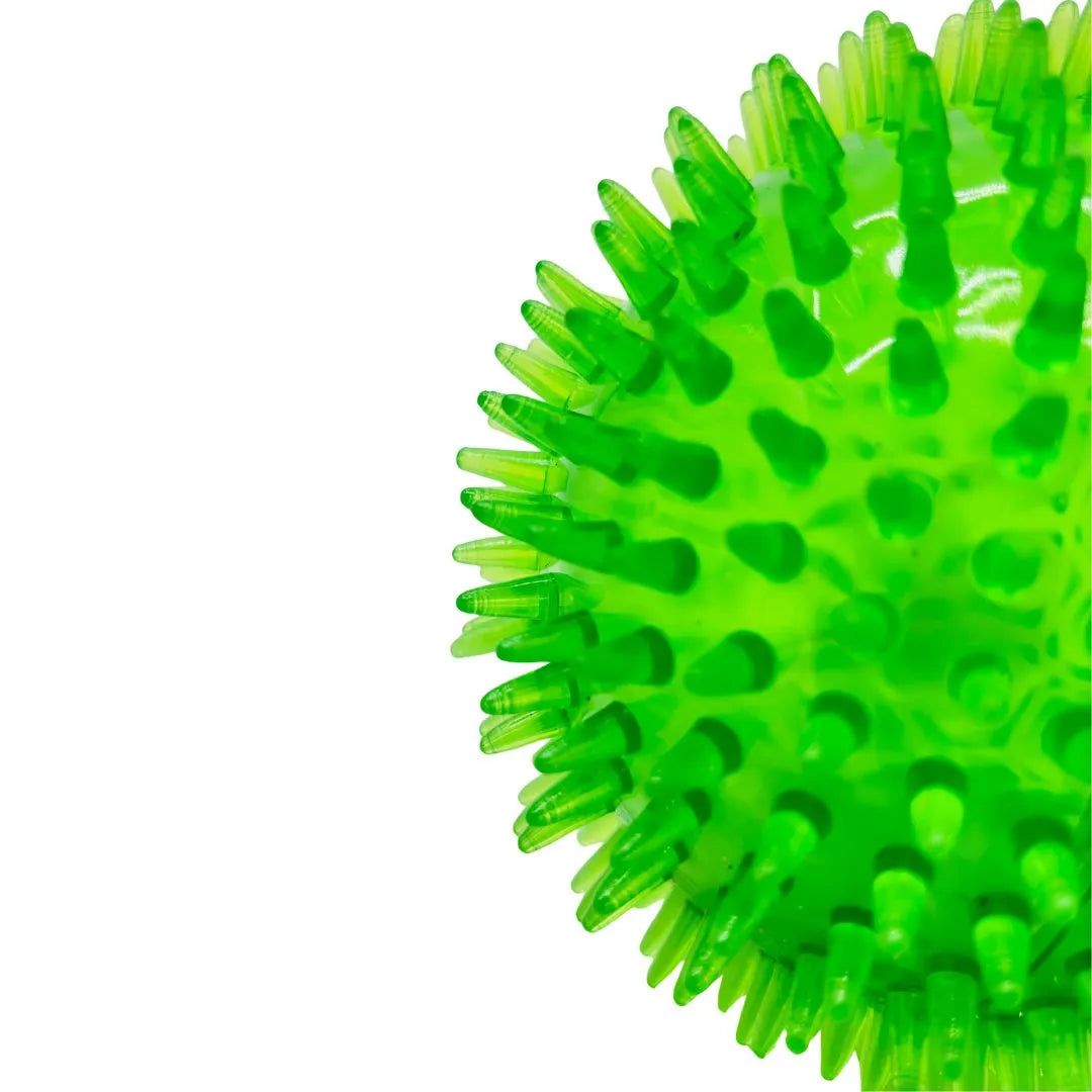 Unleash hours of engaging playtime with this Large Spiky Neon Green Squeaky Dog Ball. Designed for dogs who love to chase, chew, and hear a satisfying sound, this toy features a full surface of soft, flexible spikes or nodules. This unique texture provides great tactile stimulation and acts as a gentle gum massager and tooth cleaner during play.