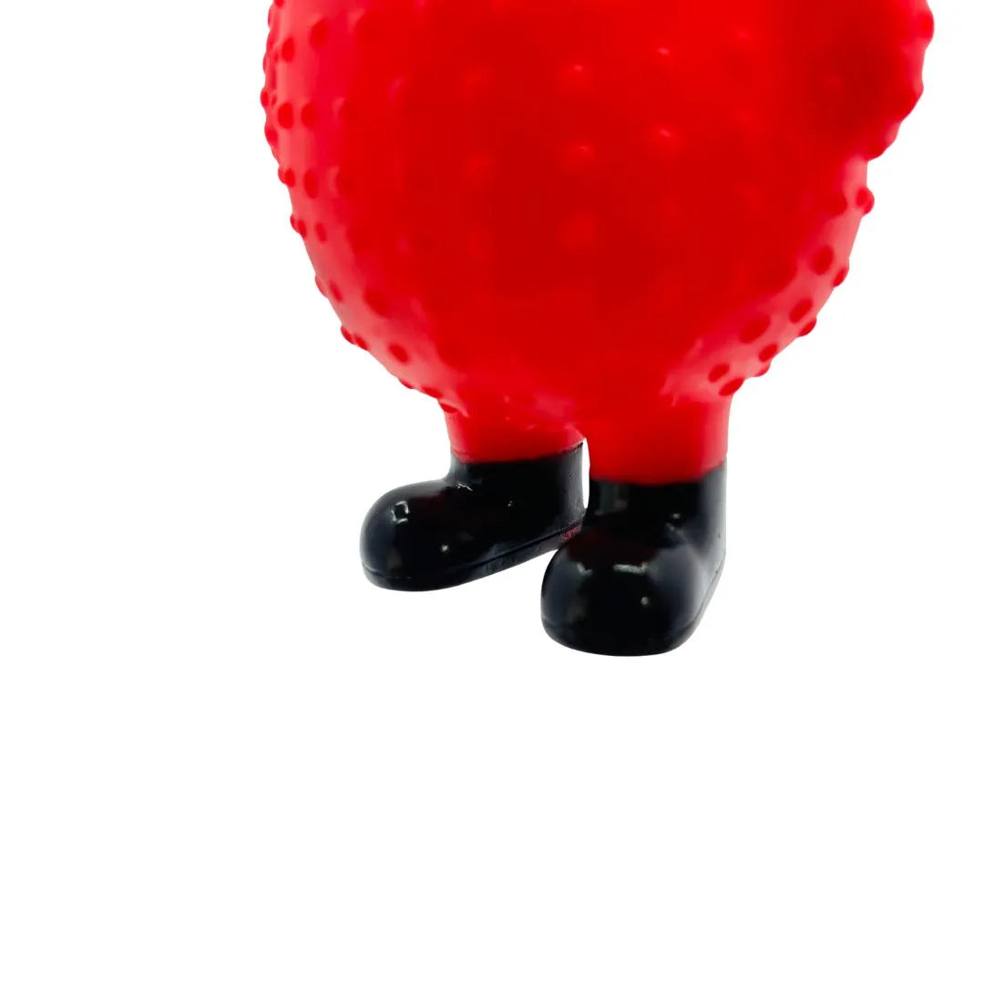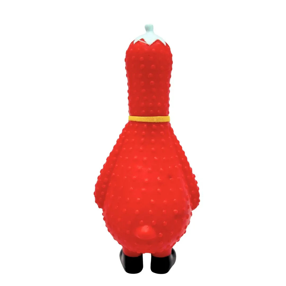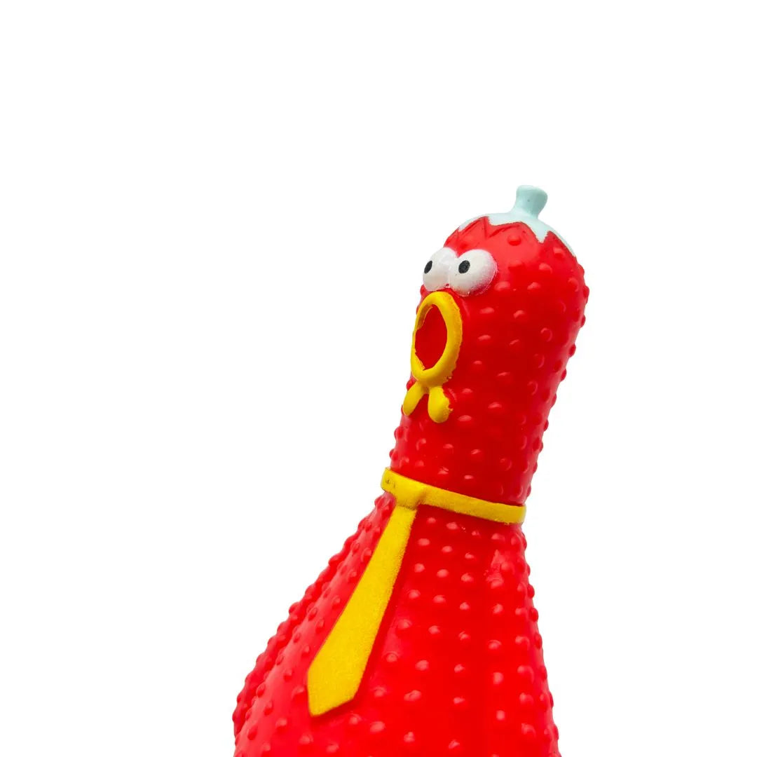 The toy's standout feature is its comical appearance: a bright red chicken with a textured, bumpy body (for an easy grip), wide googly eyes, and a ridiculously long neck, dressed for business with a yellow tie. The most engaging element is the embedded squeaker, which, when squeezed or chewed, lets out a loud, funny squawk or scream that is highly stimulating for dogs, satisfying their natural urge to make noise and play. The durable build ensures it's a long-lasting source of fun, perfect for interactive games of fetch, shake, or just for your dog to wrestle with as a goofy companion.