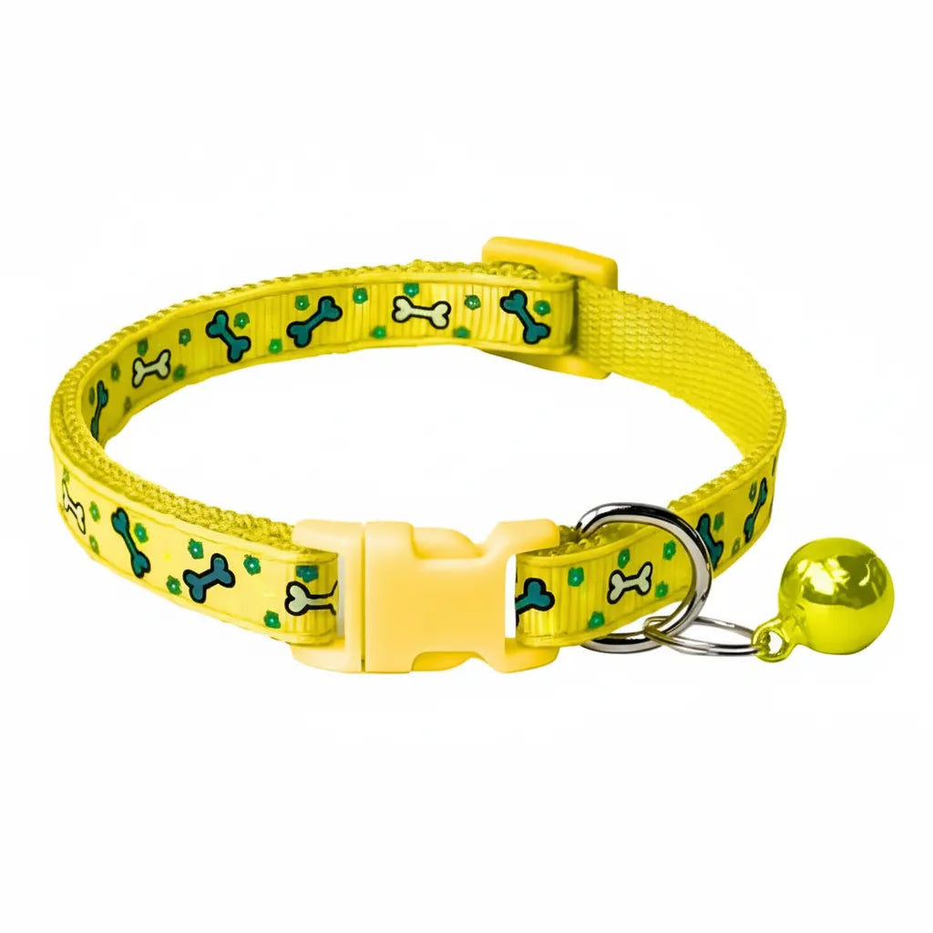 Equip your Puppy/small dog or cat with this stylish and functional Adjustable Yellow Bone Printed Collar. Designed as a fancy accessory for puppies, small dogs, and cats, the collar is made from durable yet lightweight nylon webbing in a vibrant, eye-catching Yellow color. It features a cheerful, repetitive pattern of blue paw prints and white/blue bones, making it a playful and fashionable statement for everyday wear.