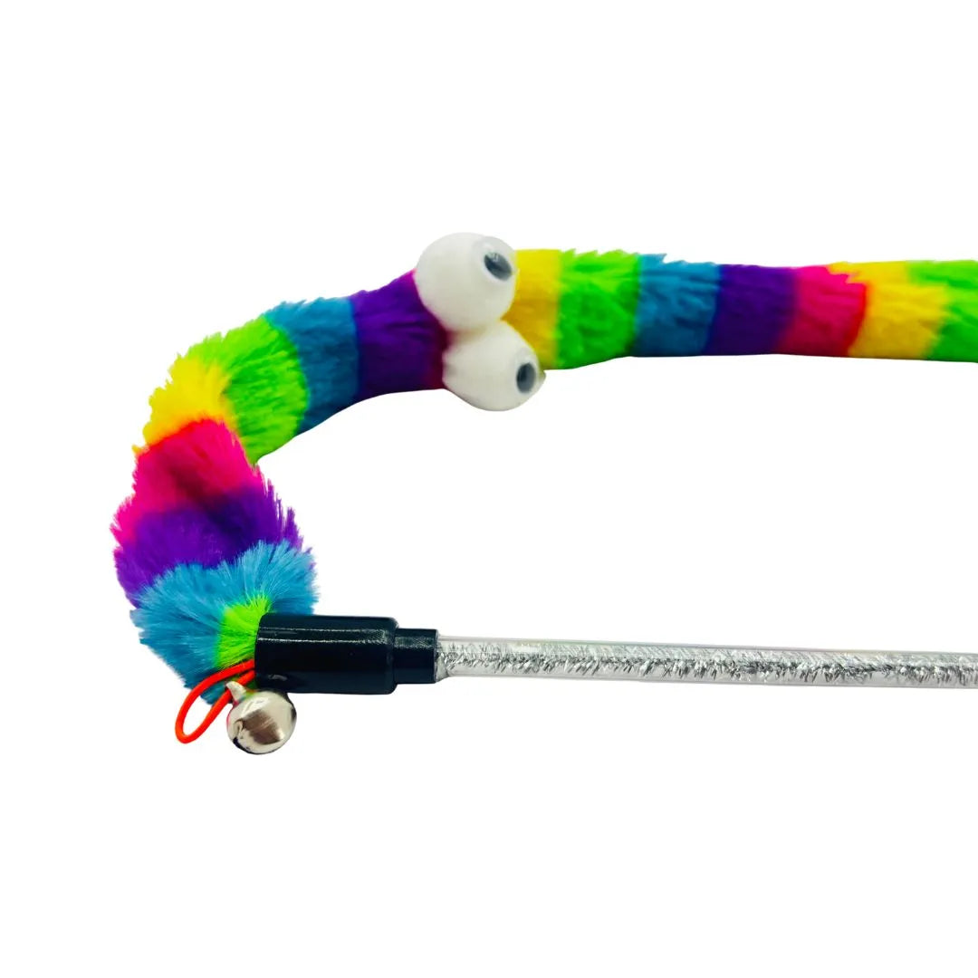Unleash your cat's inner hunter with the Fuzzy Worm Cat Teaser Wand Toy! This highly engaging interactive toy is designed to captivate your cat with its vibrant look and mesmerizing movements. The lure is a long, soft, plush worm featuring an eye-catching multi-color rainbow stripe pattern and comical googly eyes. This fluffy texture is irresistible for pouncing, batting, and gentle carrying.